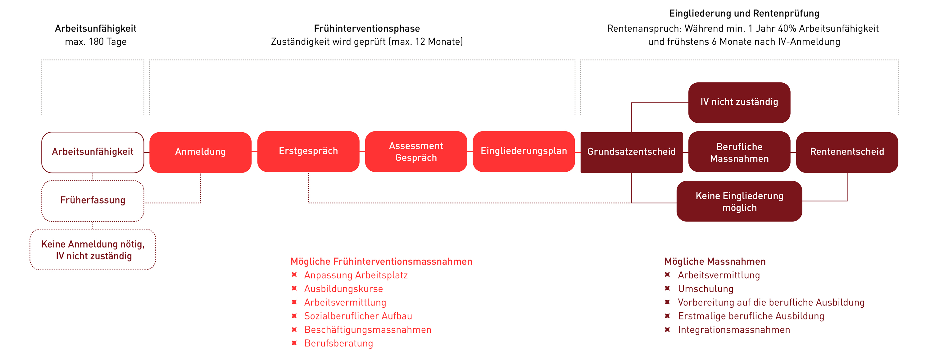 Zeichnet sich ab, dass eine gesundheitliche Beeinträchtigung zu einer vollständigen oder voraussichtlich längerdauernden Invalidität führen wird, ist eine frühzeitige Anmeldung wichtig. Nur so kann zum Beispiel mit Eingliederungsmassnahmen verhindert werden, dass jemand seine Arbeitsstelle verliert. Der Rentenanspruch besteht frühestens 6 Monate nach dem Einreichen der Anmeldung bei der IV-Stelle und wenn während eines ganzen Jahres eine durchschnittliche Arbeitsunfähigkeit von mindestens 40% bestanden hat.